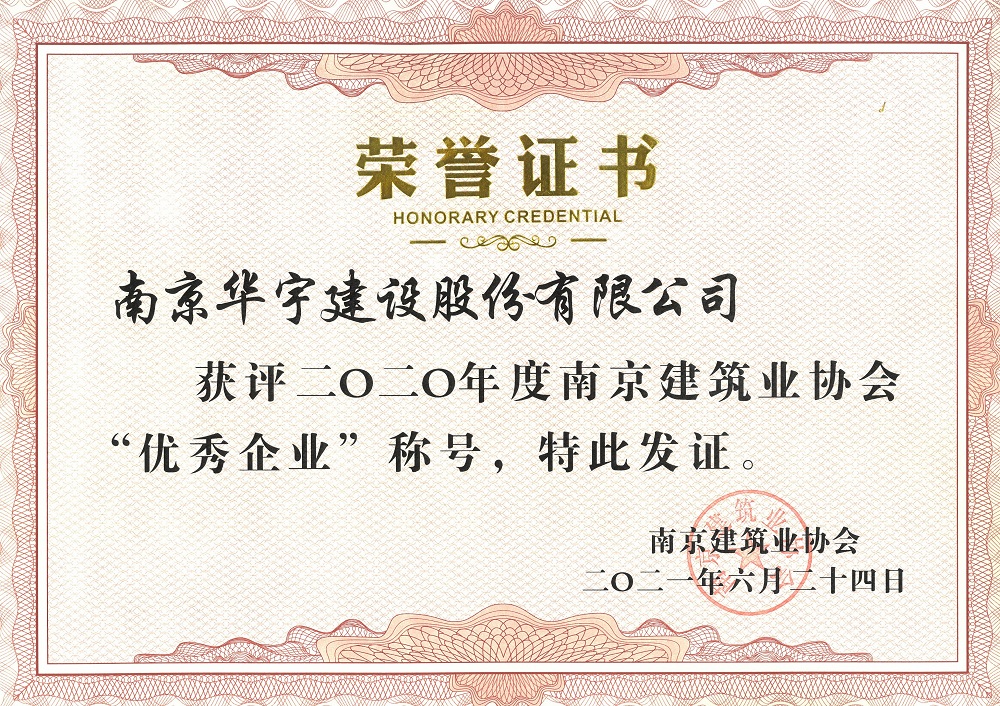 近日,南京建筑业协会发布《关于发布2020年度南京建筑业协会“优秀企业”评价结果的决定》,经过会员企业申报、资料初审、评审委员会研究审定、网上公示等评选流程,华宇股份获得“2020年度南京建筑业协会优秀企业”荣誉称号。